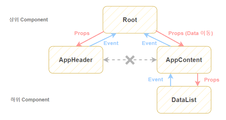 만약 같은 레벨의 컴포넌트끼리 값을 주고받으려면, 상위 컴포넌트로 Event를 발생시켜 다시 하위 컴포넌트로 Props를 내려주어야 한다.
