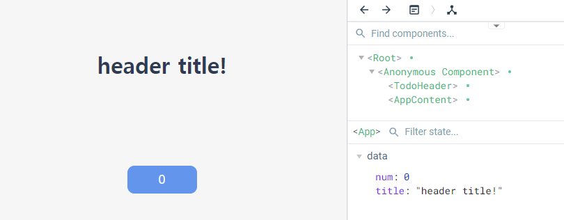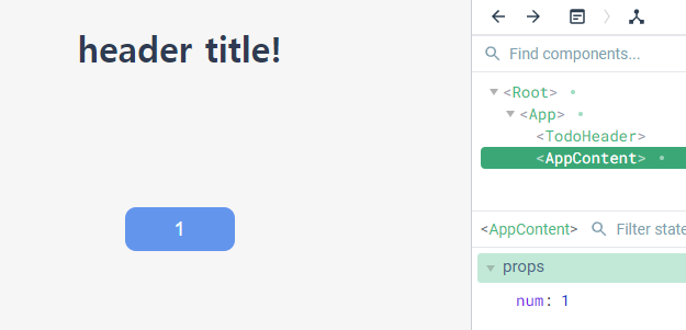 increaseNum은 App에 있는 num이라는 데이터 값을 1씩 증가시킨다. 이렇게 상위에서 변한 num이 하위에도 반영된 것을 확인할 수 있다.