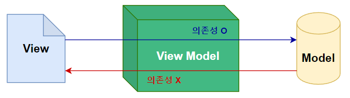 View는 View Model을 알고, View Model은 Model을 알지만, Model은 View Model을 알 수 없고, View Model은 View를 알 수 없는 단방향으로만 의존성이 존재하기 때문에 View와 Model 사이에는 의존성이 없다.