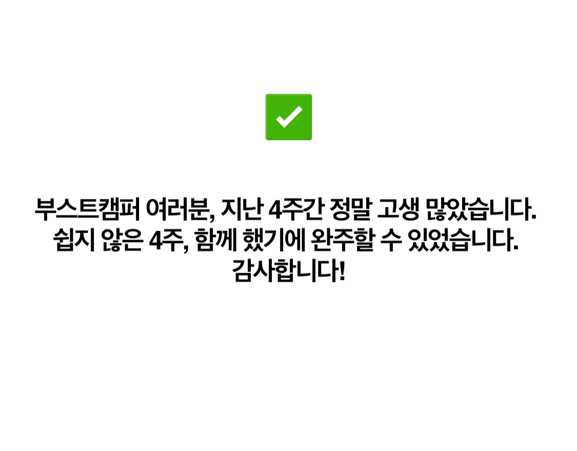 이건 살짝 변명일 수도 있지만 4주간 매일 다른 미션을 수행하다 보니 한번 놓친 내용은 학습하기가 벅찼다. 위에서처럼 한번 밀리기 시작하면 4주가 끝난 후에야 제대로 정리할 수 있었던 점이 아쉬웠다.